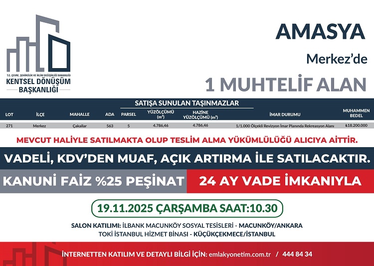 Kentsel Dönüşüm Başkanlığımızca, 18 - 19 Kasım 2025 tarihlerinde, Amasya Merkez’de 1 (Bir) adet taşınmaz ile birlikte, 51 İlde 512 Arsanın, açık artırmalı satış yöntemi ile satış ihalesi yapılacaktır.